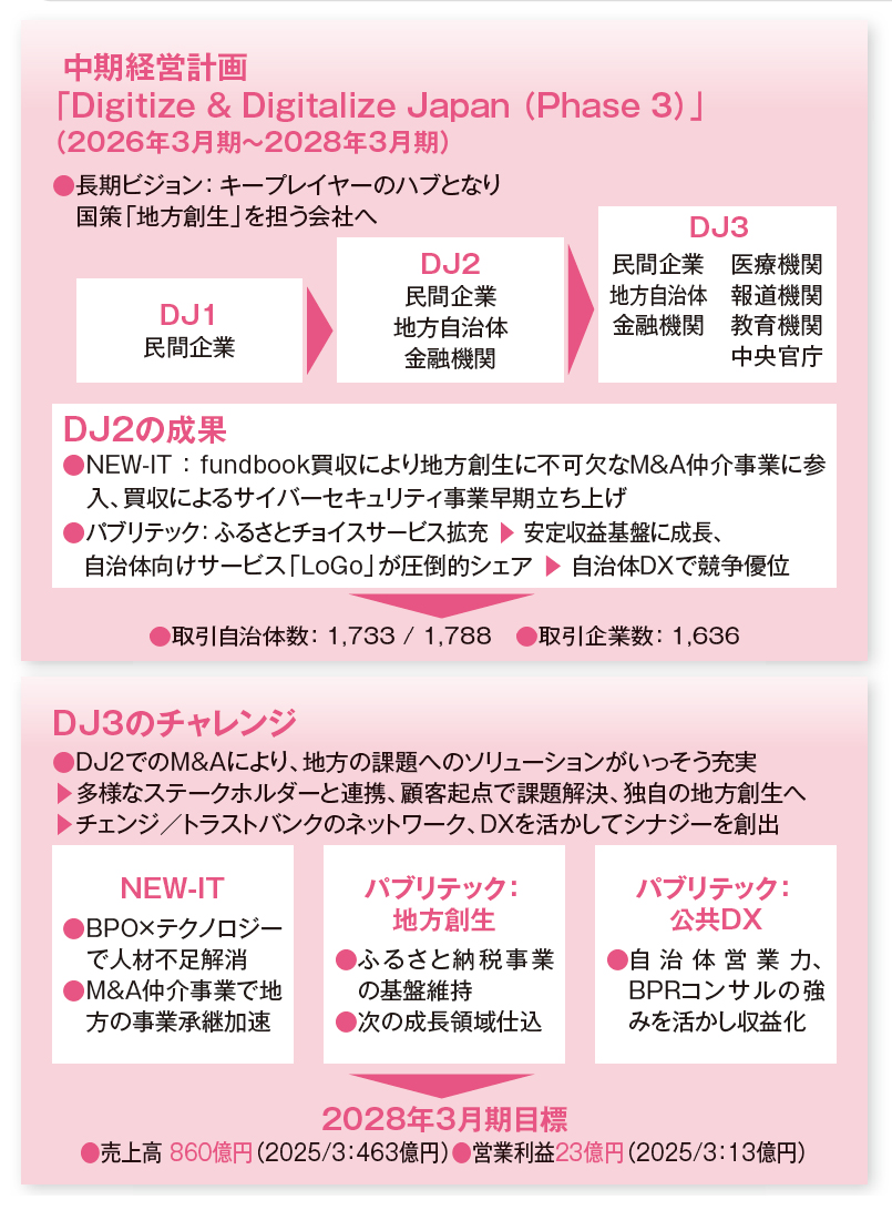 このパブリテックと並んで二大事業領域を成すのが「NEW-ITトランスフォーメーション」。テクノロジーやデジタル人材育成を通じて業務・ビジネスモデル変革、生産性・付加価値向上を目指す民間DXサービス事業だ。ここでも、自治体DX強化に向けたガバメイツ設立(2022年)、公共向けSaaSに強いガバメントテクノロジー子会社化(2023年)など、旺盛なM&Aによって体制づくりを進めてきた。中期経営計画「Digitize & Digitalize Japan」は現在「Phase 3」段階にあり、NEW-IT分野で事業承継を加速する他、パブリテック分野でも自治体向けチャットツール「LoGoチャット」が導入1,500件を超えるなど、着々と事業拡大、連携先拡大の成果をあげている。