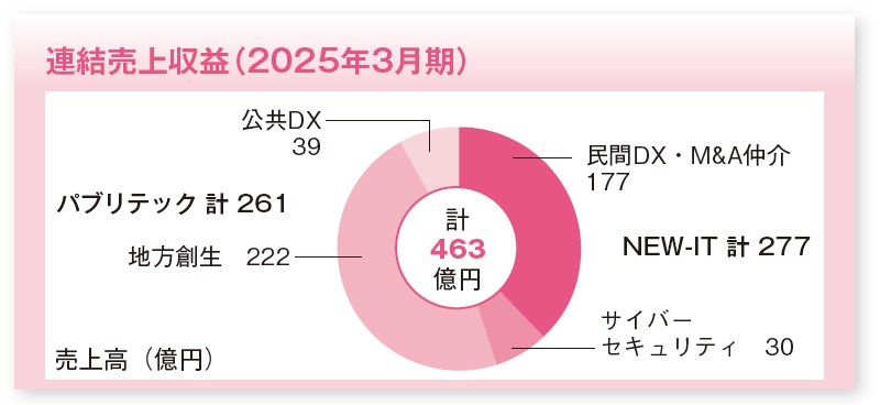 | 主な 事業内容と グループ 会社 | ●NEW-ITトランスフォーメーション事業 - 民間DX、M&A: チェンジ、fundbook、DFA Robotics、ビーキャップ - サイバーセキュリティ: サイリーグHD、 イー・ガーディアン 他 ●パブリテック事業 - 地方創生(ふるさと納税など): トラストバンク、トラベルジップ 他 - 公共DX: アップクロース、ガバメイツ、ガバナンステクノロジーズ 他 |