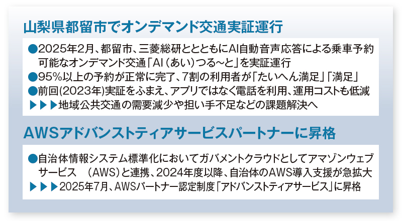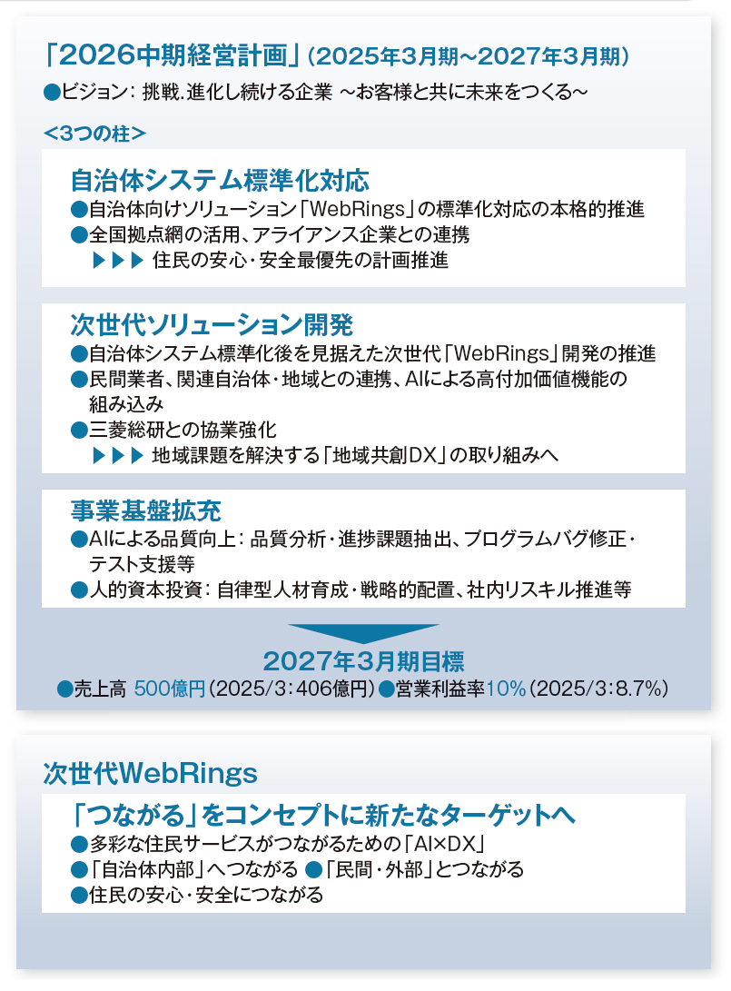 中でも、2000年に発表されたWeb型総合行政システム「WebRings」は、日本初の自治体向け基幹業務システムで、スピーディーな導入、サービス多様化や法改正への迅速な対応といった特性から全国の市町村に豊富な導入実績がある。2025年3月期から2027年3月期までの中期経営計画では、自治体のシステム標準化対応、次世代ソリューションの開発、事業基盤拡充の3つの戦略を進めているが、次世代ソリューション開発では、このWebRIngsをさらに進化させ、「AI×DX」によって、自治体内部、民間・外部、住民の安心・安全に「つながる」ことをコンセプトに付加価値の高い機能を組み込む計画だ。また、2018年に業務資本提携を結んだ三菱総合研究所との協業によるAIを活用した新サービスも展開、地域課題を解決する「地域共創DX」を目指す。