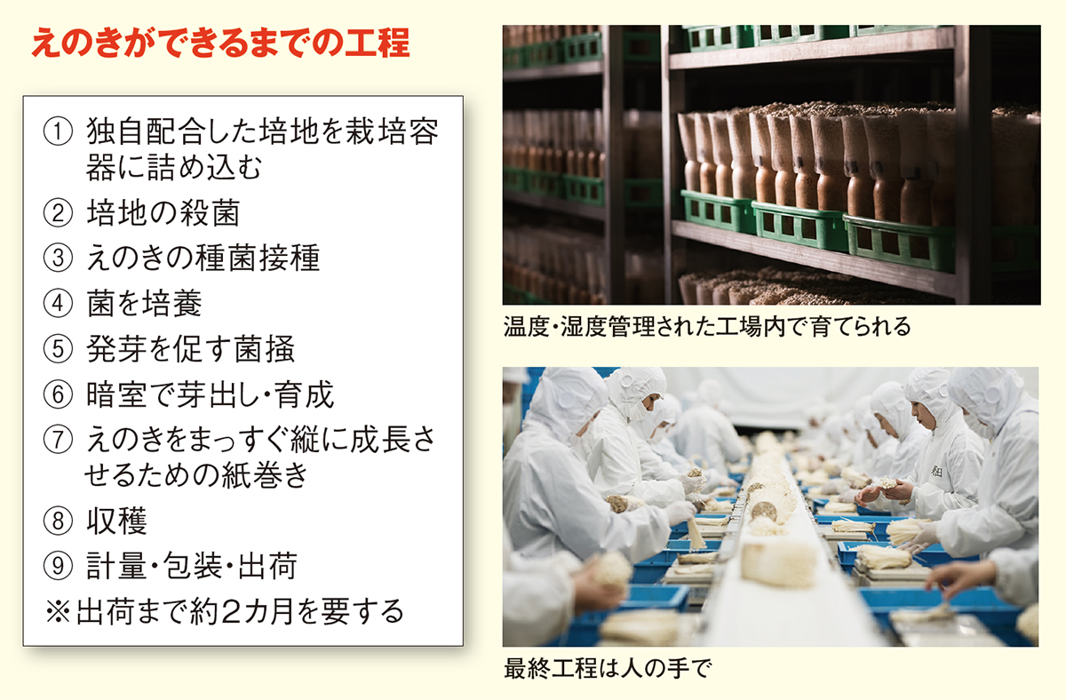 えのきは容器に入れられた状態で、温度と湿度が管理された真っ暗な冷蔵庫に入れられて育つ。一定期間が経つとフォークリフトで選別機にかけ、出荷できるものと、さらに冷蔵庫で育てられるものに分ける。工業製品ではないため、同じ条件で育てても育ち方は微妙に違いが出る。収穫されたえのきは、人の手で適度な大きさに分けられ、パッケージされて出荷される。