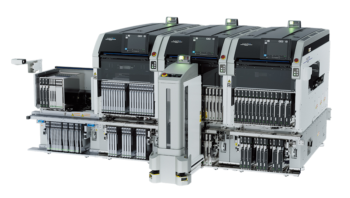 電子部品実装ロボット「NXTR Aモデル」。高速・高精度に加え、段取り替えや部材補給作業を自動化するロボットを搭載