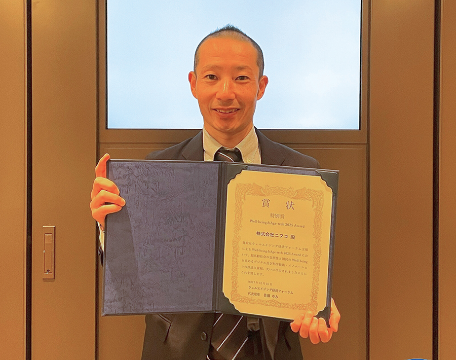 こうした実践的な研究成果の一例として、院生・渡邉啓さん(株式会社ニフコ)が、所属企業として「Well-being & Age-tech 2025 Award」特別賞を受賞した。本アワードは、超少子高齢化という世界共通の課題に対し、科学技術やイノベーションを活用した優れた取り組みを表彰するものである。渡邉さんは、社内におけるウェルネス領域の新規事業プロジェクトリーダーとして、部署立ち上げからサービス設計、ローンチまでを一貫して担当。転倒リスクに着目し、足把持力を簡便に測定・可視化するとともに、ゲーミフィケーションを取り入れた継続性の高い体験を提供する事業を開発し、高い評価を得た