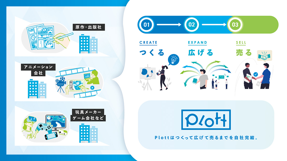 Plottは、設立後1年間はVTuber事務所だった。代表を務める奥野氏は「当時の嵐のような市場の中での事業はなかなか厳しく、その時にSNSでマンガやアニメがとても伸びていることを感じ、『テイコウペンギン』というショートアニメ作品をリリース。これが最初の転機になった」と振り返る。そこから複数の作品をリリースし、さらにSNS以外にも活躍の場を広げるべく、BtoBに強みを持つ株式会社BUZZCASTと経営統合。アニメ以外にもゲームやグッズに事業を拡大し、現在はメディアミックス企業として成長を続けている。