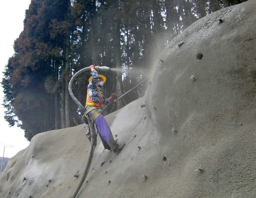 法面(人工的に作られた斜面)を保護する法面工事。高度成長期に施工された場所では老朽化が進み、対策が求められている