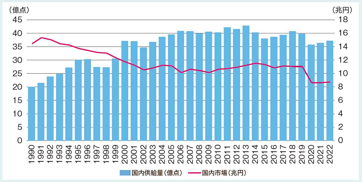 国内アパレル市場は1991年にピークを迎えた後、縮小した。2020年以降は8兆円台半ばで推移している。 一方、供給量は1991年より増えている
