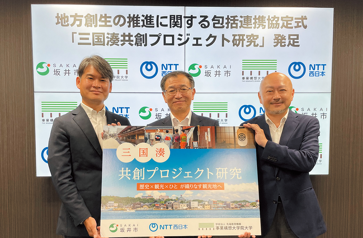 その課題に対し、坂井市は、地域企業と共同で三国湊に「Actibaseふくい」を設立して同エリアの活性化に取り組んできたNTT西日本、そして事業構想大学院大学と連携し、観光分野を中心とした新たな事業構想を構築していく。