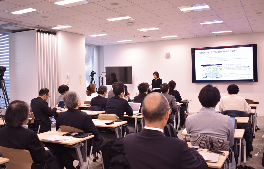 今回の研究会開催にあたり、事業構想大学院大学の田中里沙学長は、「今求められるのは知識のフォロワーではなくリーダー。新しい知識を得て、さらに新たな知を生み出す人材です」と聴衆に語りかけた。そして、異業種の価値観に触れる越境学習の機会を提供するなど、構想が生まれる環境を整えてきた大学院の取組を紹介した。変化の激しい社会の中で、試す力・達成への執念・伝える力など、構想する力を備えた人材を育成する意義は大きい。将来の関西経済を支えるためにも、経営戦略と人事戦略を連動させ、企業変革の鍵とすることが重要になる。