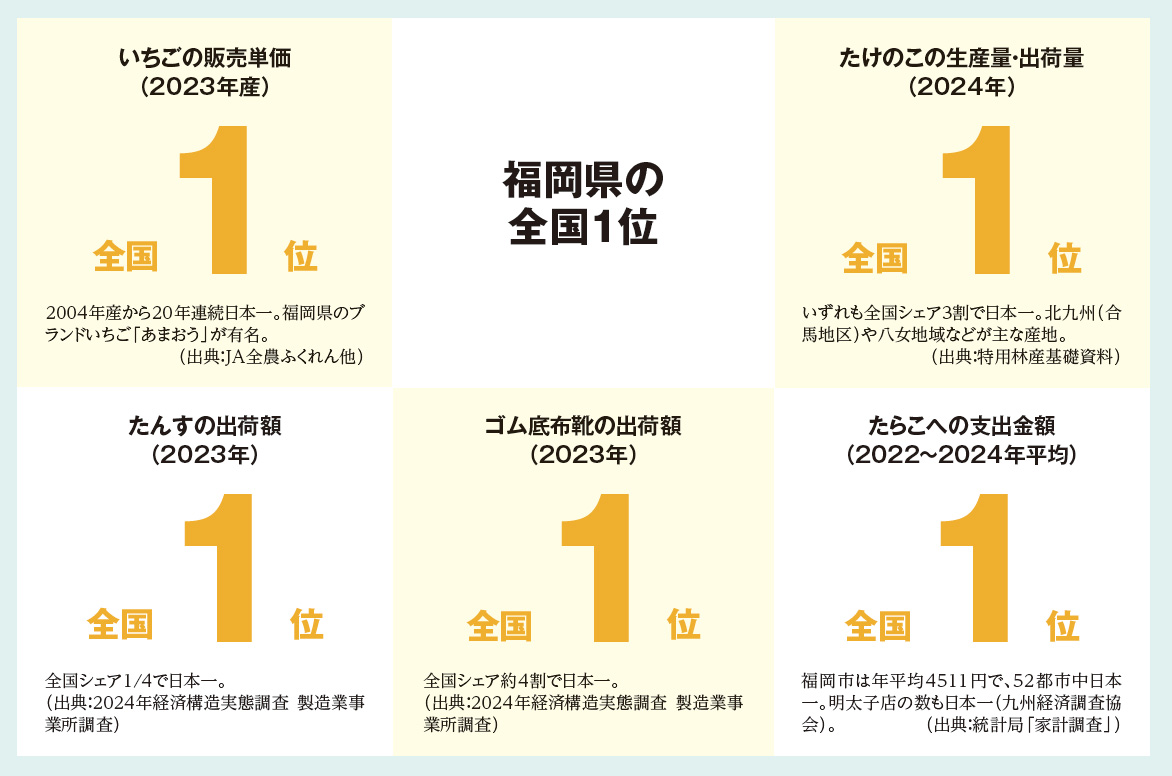 福岡市、北九州市という2つの政令市を有し、九州最大の都市圏を形成する福岡県。福岡市の開業率は7年連続日本一で、2025年には県初のスタートアップ支援拠点が開業。農林水産業が盛んで、農業ではブランドいちご「あまおう」が販売単価日本一、たけのこの生産量が日本一となっている。