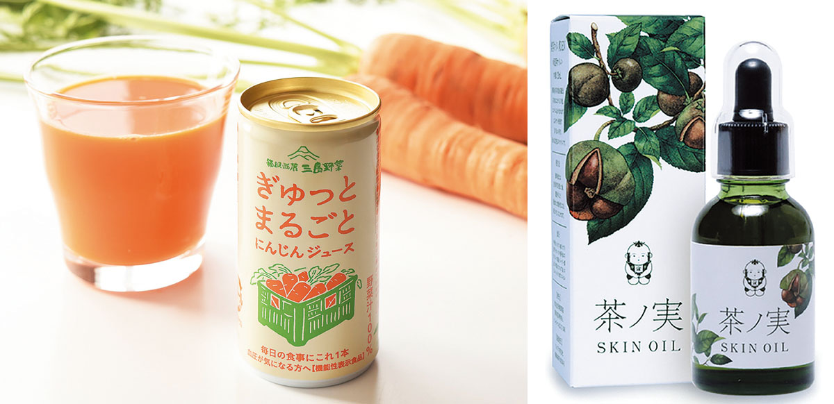 左/箱根西麓の三島人参だけを使用した100%人参ジュース(機能性表示食品)「ぎゅっとまるごとにんじんジュース」、右/県産の茶の実成分を配合した全身保湿オイル「茶ノ実SKIN OIL」