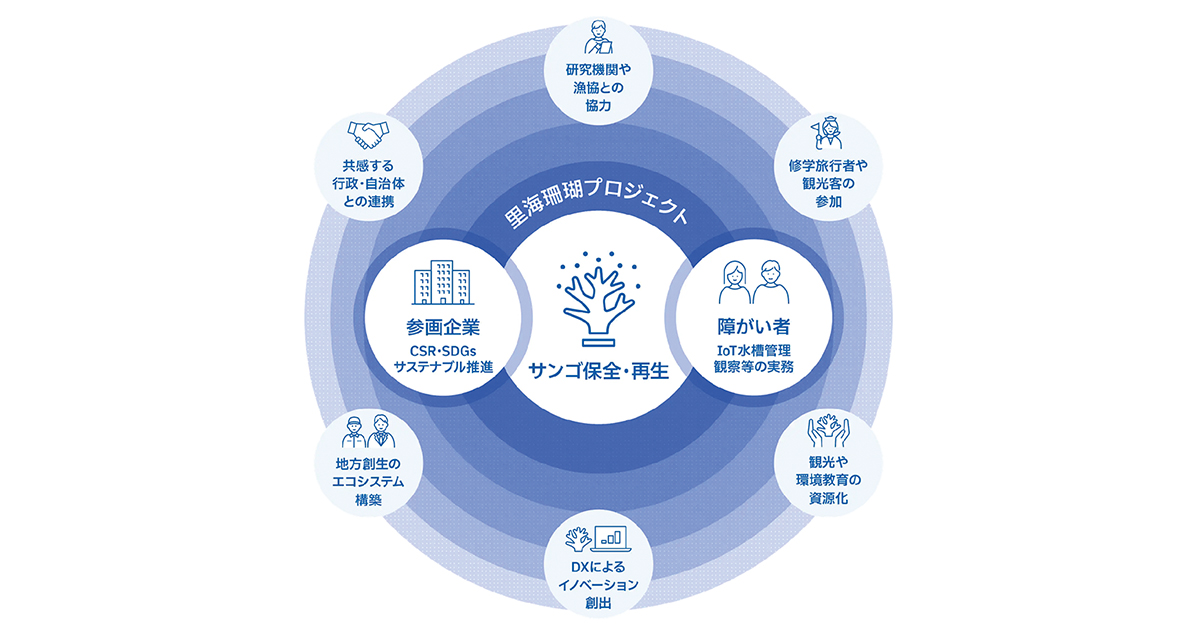 珊瑚の保全活動では海中での養殖と植え付けが一般的だが、村上氏は陸上で養殖して海中に植え付ける方式を採った。カギを握るのは水温や水質などをモニタリングするデジタルサイネージや水槽データ管理アプリケーションなど、最新テクノロジーを活用した「水槽DX」で、その管理業務を障がい者が担うスキームを考案。村上氏は2025年4月22日のアースデーに里海珊瑚プロジェクト株式会社を設立し、12月には東京(千代田区神田淡路町)にショールームとなる拠点をオープン。障がい者雇用が必要な企業を広く募っている。