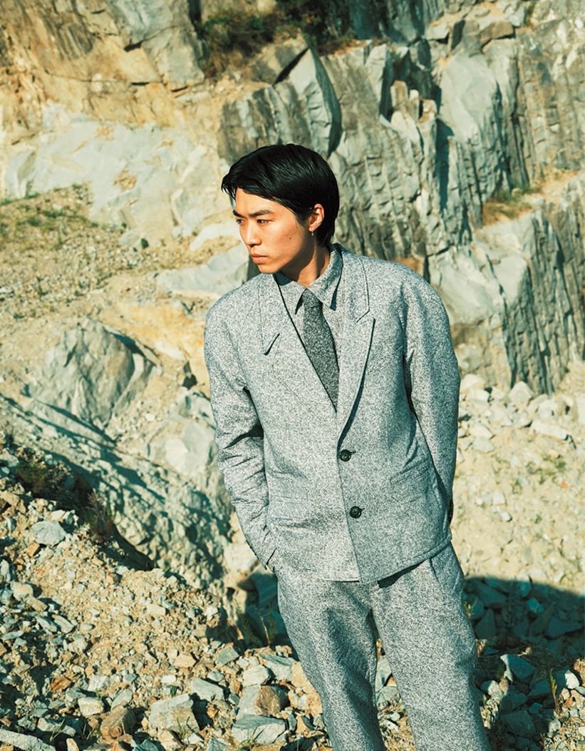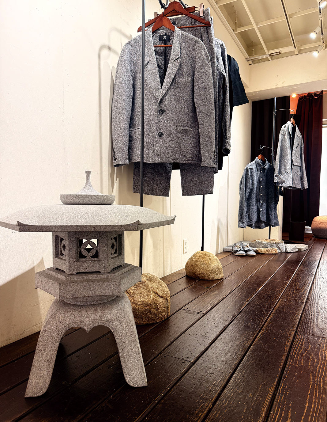 庵治石の特徴的な斑模様をあしらったスーツ一式
