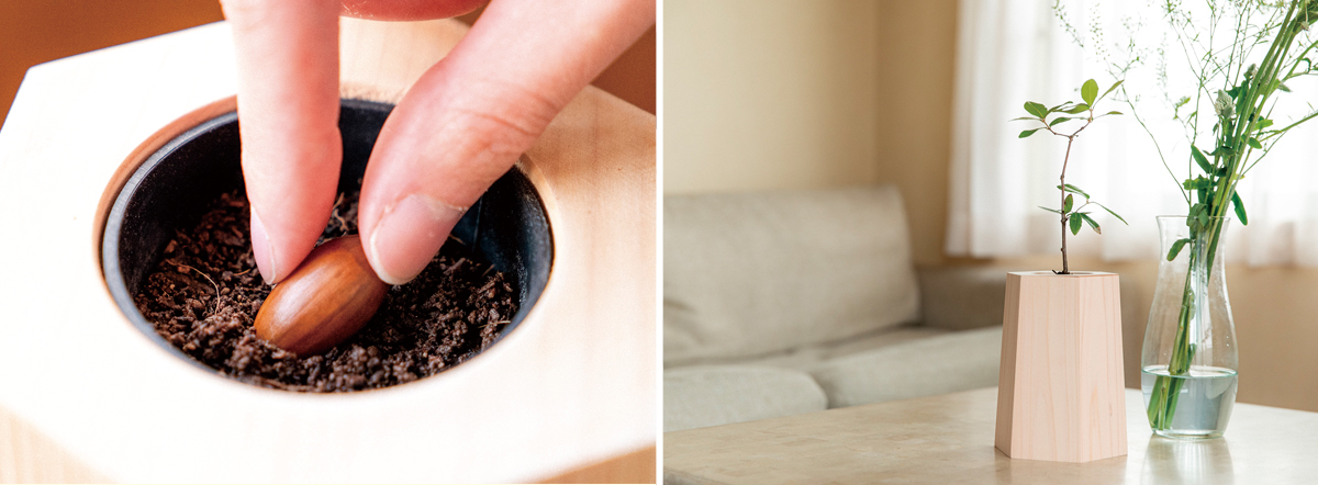 室内で、どんぐりから2年間かけて育てる観葉植物「MODRINAE」。育てた苗木をソマノベースに返すと、木が植えられていない山へ植林される