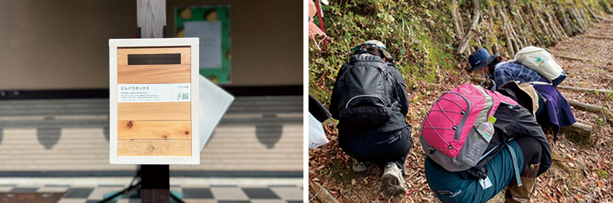 田辺市後援のどんぐり収集プロジェクト「三度(たびたび)」。熊野古道沿いにどんぐりBOXを設置し、熊野の地を訪れる人に観光しながらどんぐりを拾ってもらい、回収する