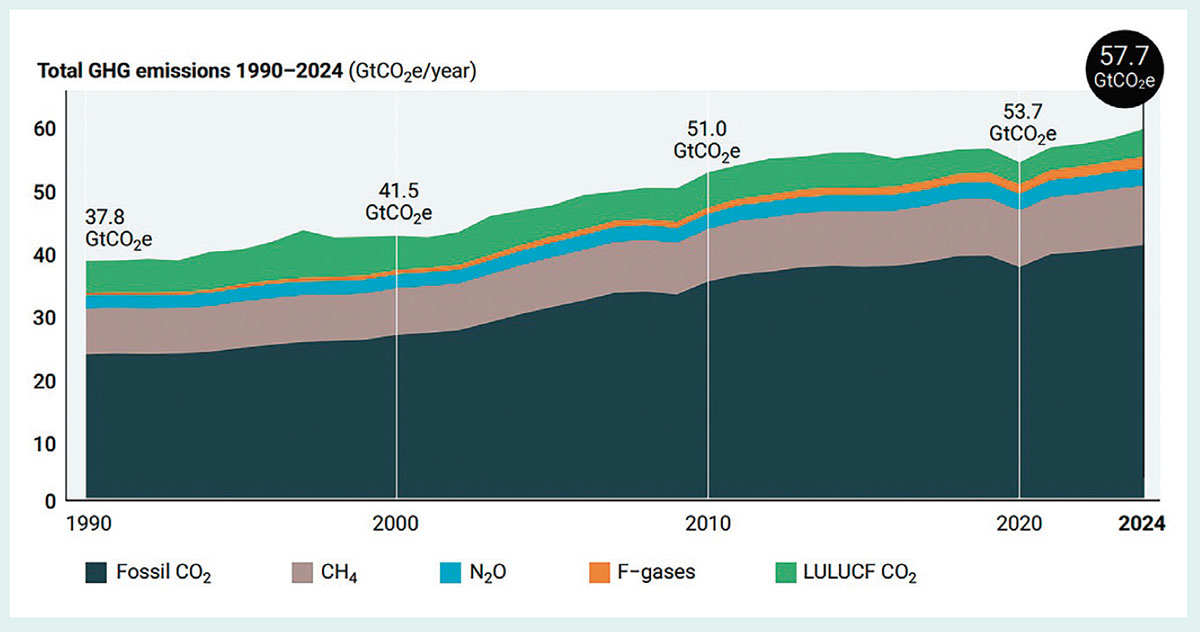 世界の温室効果ガス排出量は2024年に57.7ギガトン(CO2換算)に達し、2023年比で2.3%増加した。これは、2010年代の年間平均増加率(年0.6%)の4倍以上であり、2000年代の排出量増加率(年平均2.2%)に匹敵する高い数値