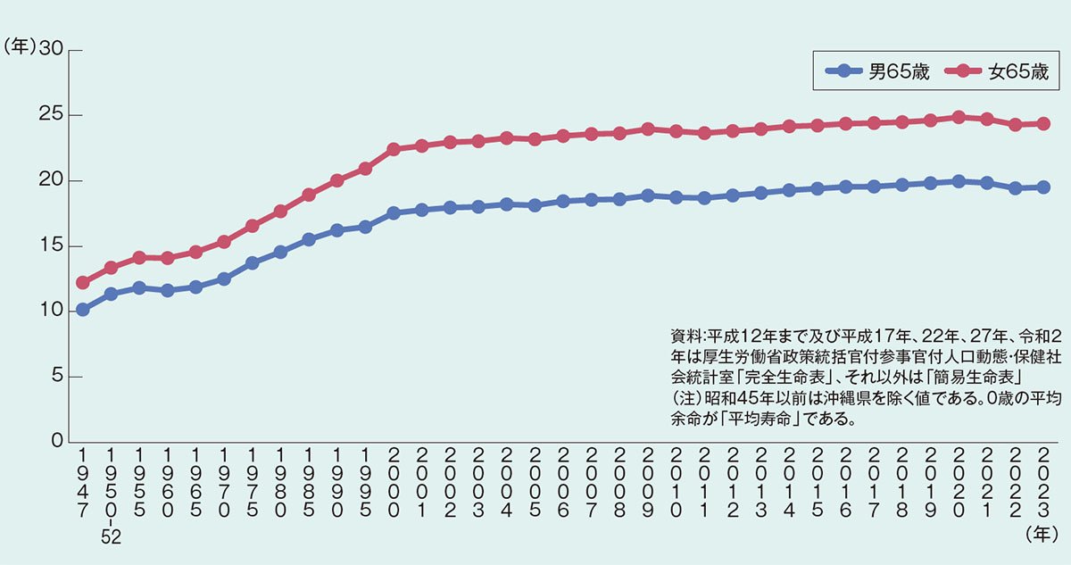 現在、65歳時点で期待できる平均余命は、男性20年、女性25年となっている