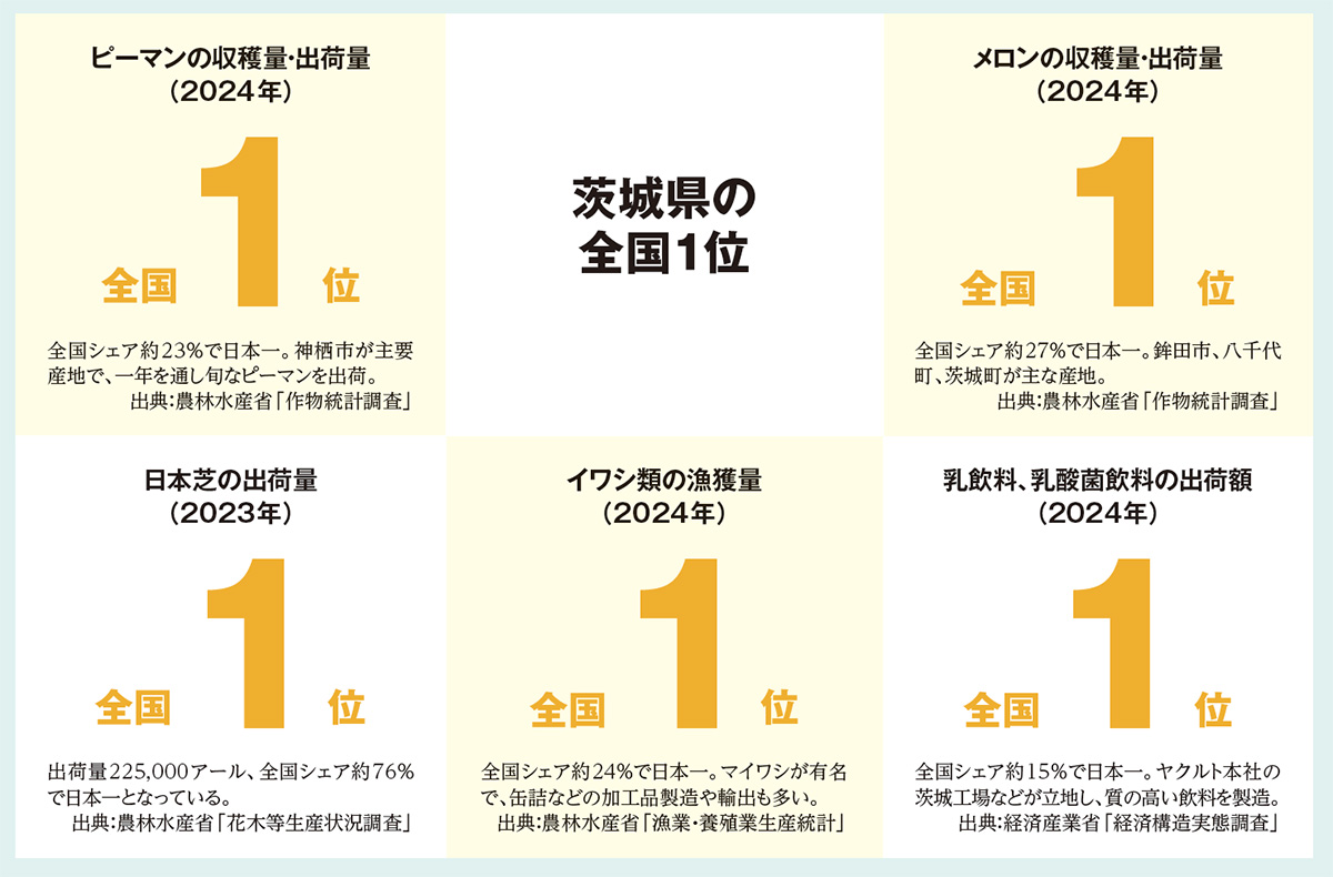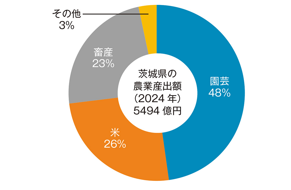 茨城県の農業産出額は5494億円で、北海道、鹿児島県に次ぐ全国3位。内訳では園芸(いも類・野菜・果実・花き)の割合が最も多く、48%を占めている。陸稲、れんこん、白菜、小松菜、水菜、ねぎ、ピーマンなど、多数の農産物が全国シェア1位となっている。