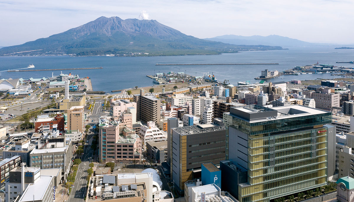 桜島と、2019年12月に竣工した鹿児島銀行本店ビル(右手前)