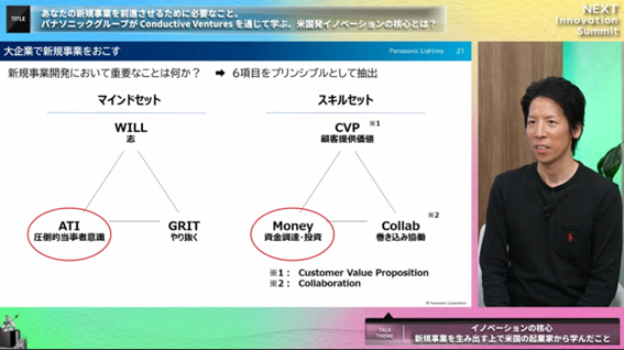スキルセット CVP(顧客への提供価値)、コラボレーション(社内外の巻き込み)、MONEY(資金)