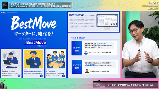 NECが開発したAI×オープンイノベーションで開発した新規事業の第一弾が、マーケター向け支援ツール「BestMove」だ。同・小図子武弘シニアマネージャーは「自分たちの商品がどう売ればいいのか、どんな顧客に出せばいいのかを迷っているケースに対して確信を持たせるようなソリューション」と説明する。特徴は、クレジットカードの購買傾向分析データから消費者の趣味嗜好を分析し、商品に適した顧客セグメントを動的に抽出する点にある。NECの独自技術「属性拡張技術」により、数千万人のデータから商品に反応しやすいユーザーを特定し、趣味嗜好ベースでクラスター分析を行う。また、チャット型UIを通じてマーケティング素材をAIが生成し、施策の成功・失敗データを蓄積してナレッジデータベースとして機能する。「ベテランの優秀な方のマーケティング施策立案プロセスを、新人がすぐに把握して、同じような施策をその日に作ることもできる」と小図子氏は語る。実際の導入企業では売上200%向上、アイデア発想期間の大幅短縮(90%削減)などの成果が報告されているという。