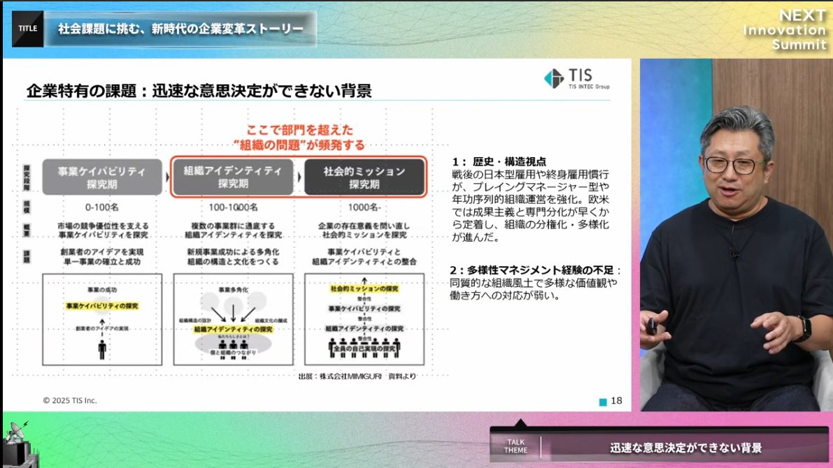 大企業特有の課題として、鈴木氏は組織規模の拡大に伴う意思決定の複雑化がある。「スタートアップでは経営者を中心としたいわば“共感ベース”の迅速な意思決定が可能ですが、大企業になると合議制が強くなり、ステークホルダーの増加により決定プロセスが長期化しがちです」また、同質的な組織風土において多様な価値観や人材へのマネジメント対応面の不足についても述べた。