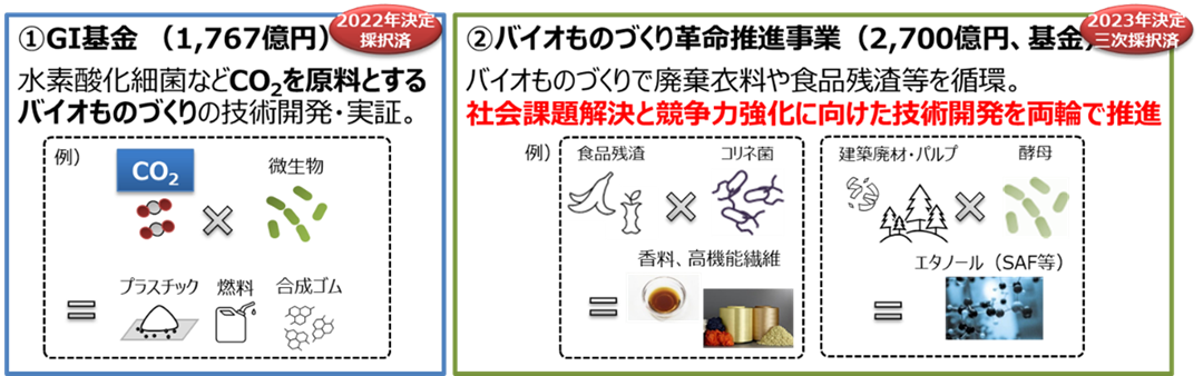 ――バイオものづくりでは、「グリーンイノベーション(GI)基金事業」と「バイオものづくり革命推進事業」の主に二つの事業を展開されています。