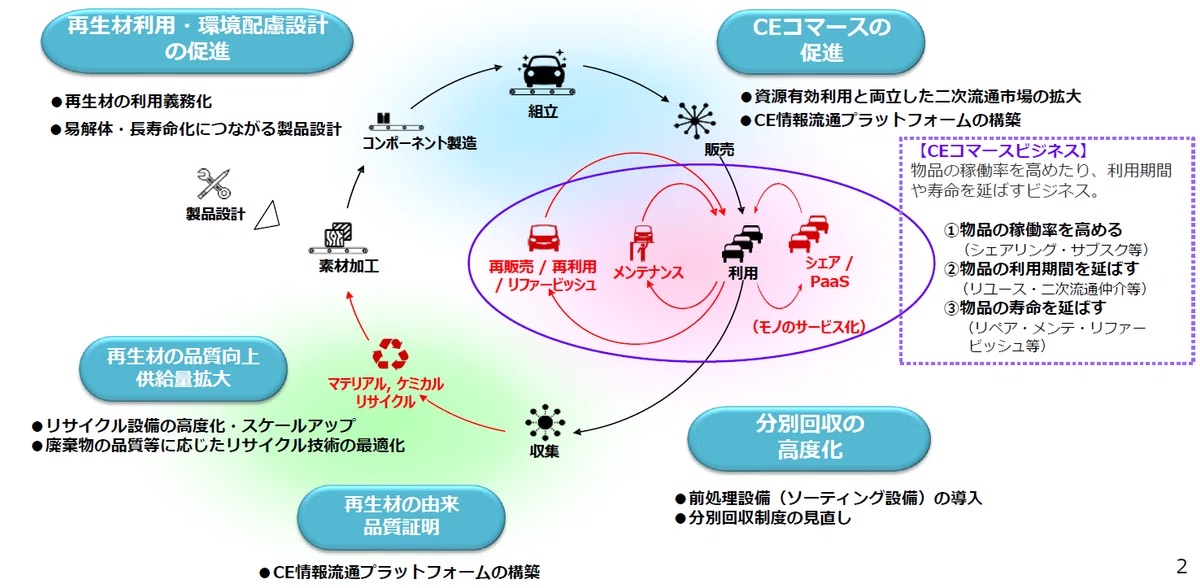 具体的には、再生材利用・環境配慮設計の促進、CEコマースの促進、分別回収の高度化、再生材由来の品質証明、再生材の品質向上・供給量の拡大など、設計からリサイクルに至るまで各段階で多面的な措置を組み合わせ、特定の段階だけでなく全体最適として資源循環を進める必要があります。