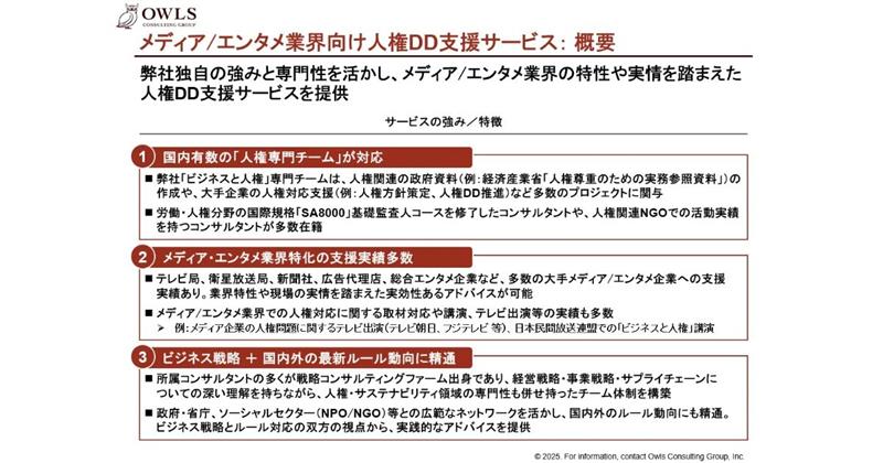 株式会社オウルズコンサルティンググループ(港区)は、メディア・エンターテインメント業界向けに特化した人権デューディリジェンス(DD)支援サービスの提供を開始した。