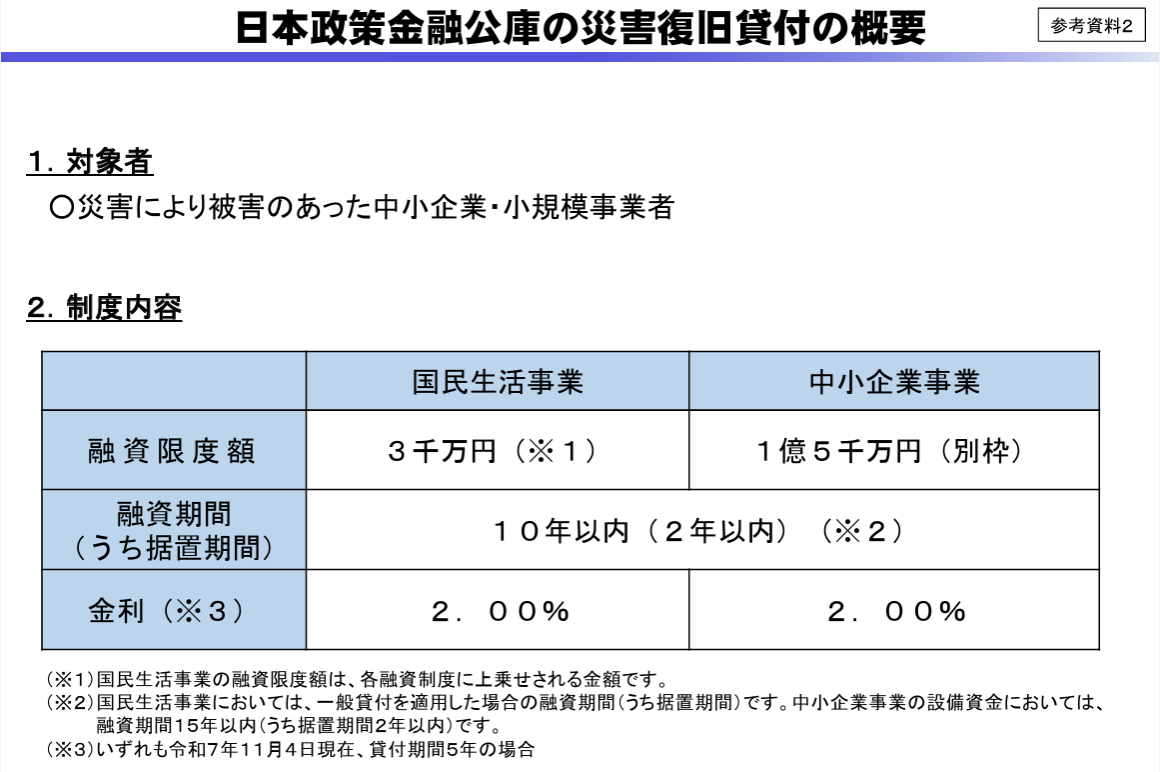 資金繰り支援としては、災害復旧貸付等を実施する。被害を受けた中小企業・小規模事業者を対象に、大分県の日本政策金融公庫及び商工組合中央金庫が運転資金又は設備資金を融資する。