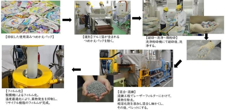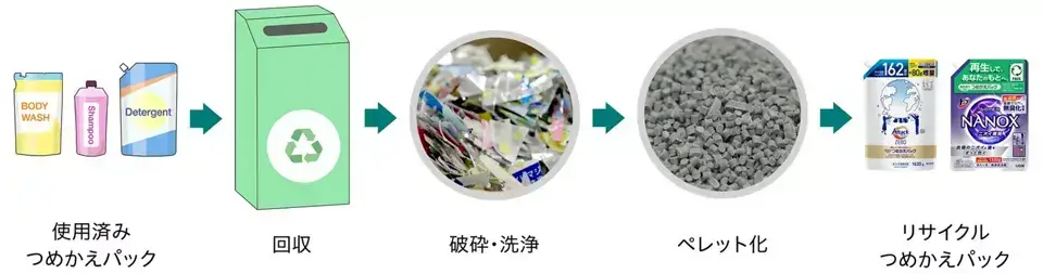 花王は2023年5月、回収した使用済みつめかえパックから再生したポリエチレンを一部に使った「リサイクルつめかえパック」を初めて製品化し、数量限定で発売した。使用済みの製品を「同じ用途で再生利用」する水平リサイクルの一例で、花王と連携して資源循環を推進してきた日用品メーカーのライオンも、同様の商品を数量限定で販売した。