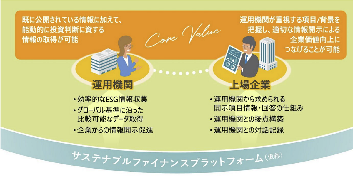 サステナブルファイナンスプラットフォームでは、上場企業が各運用機関で重視する ESG情報の開示項目などを直接かつ統合的に確認することができるサービスをβ版では提供する方針。ユーザビリティの検証や各種機能の強化をはかるなど、将来の正式なサービス開始を目指す。