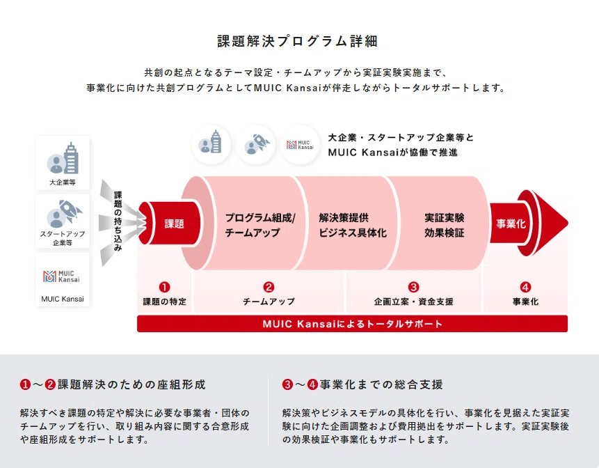 MUIC Kansaiの代表的な取り組みは「課題解決プログラム」の提供です。これは、協賛企業やスタートアップ、さらにはMUIC自らが持ち込んだ課題をもとに、解決する課題の特定から事業化までをMUIC Kansaiがトータルサポートするというものです。