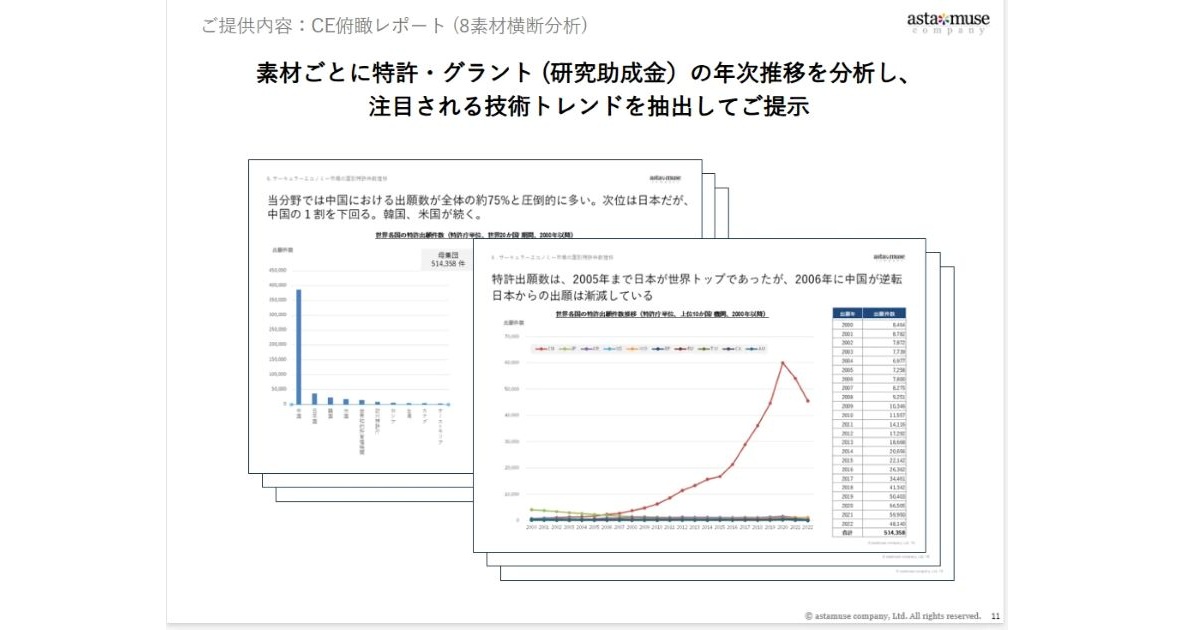 素材別CEレポートは、各素材領域に特化し、延命・再利用・再生の3つの循環戦略ごとに技術を分類したうえで、主要プレーヤーと技術競争力を定量的に分析する詳細版レポートで、素材メーカー、製品メーカーのR&D部門・技術企画部門における具体的な戦略立案に資する。2つのレポートを通して、世界中の技術・特許・研究・投資動向等の7億件超の無形資産データにもとづき、サーキュラーエコノミー領域における包括的な技術・市場分析、サーキュラーエコノミー実現に向けた技術開発の現在地と将来展望を定量的に可視化する。